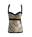 Elegant underwired lingerie top in shimmering gold jacquard. Glamorous bustier with black accents. Flattering fit with luxurious finish. <READ MORE>..