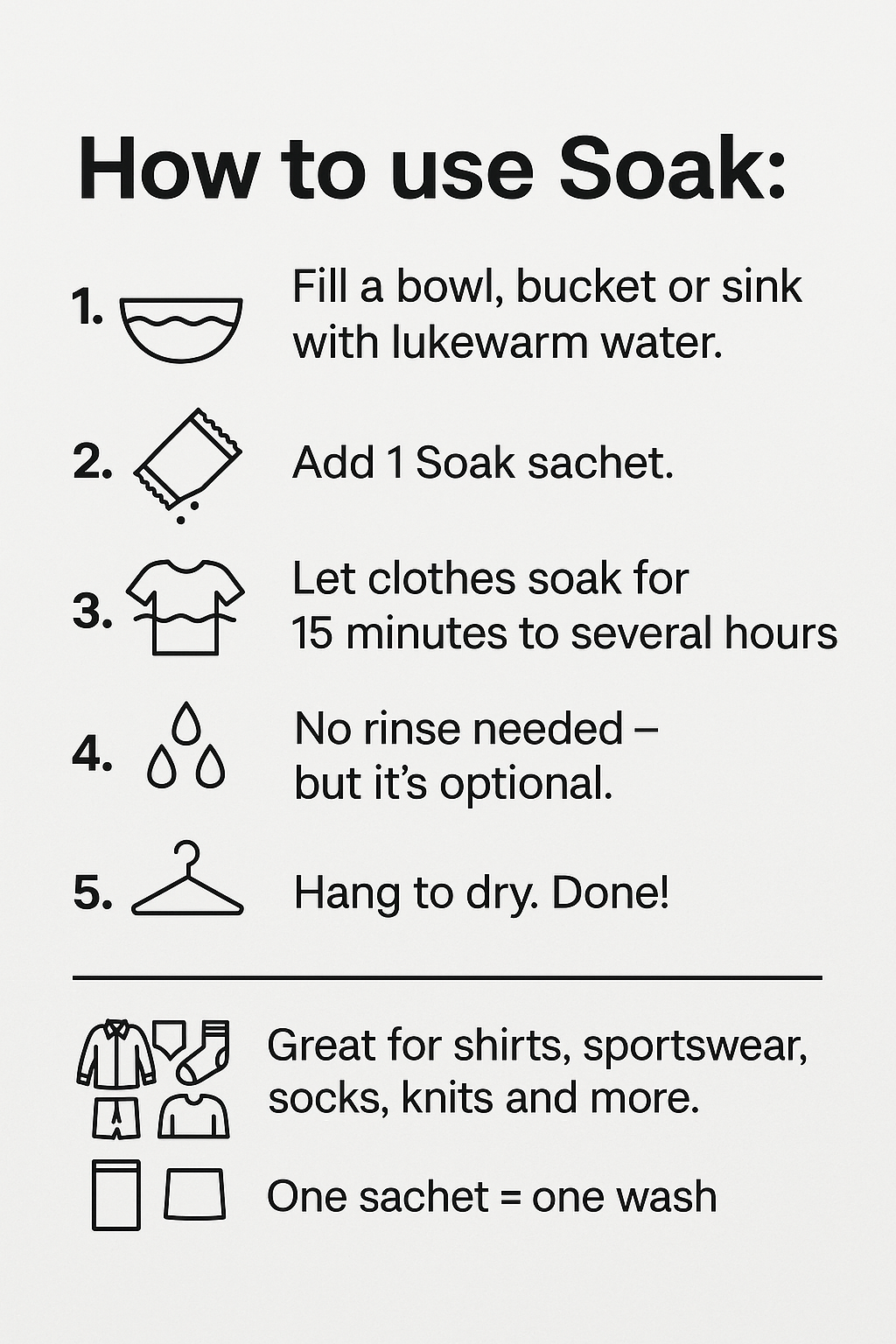 Use: 1 sachet + water, soak clothes, done. Rinsing? Only if you want to.